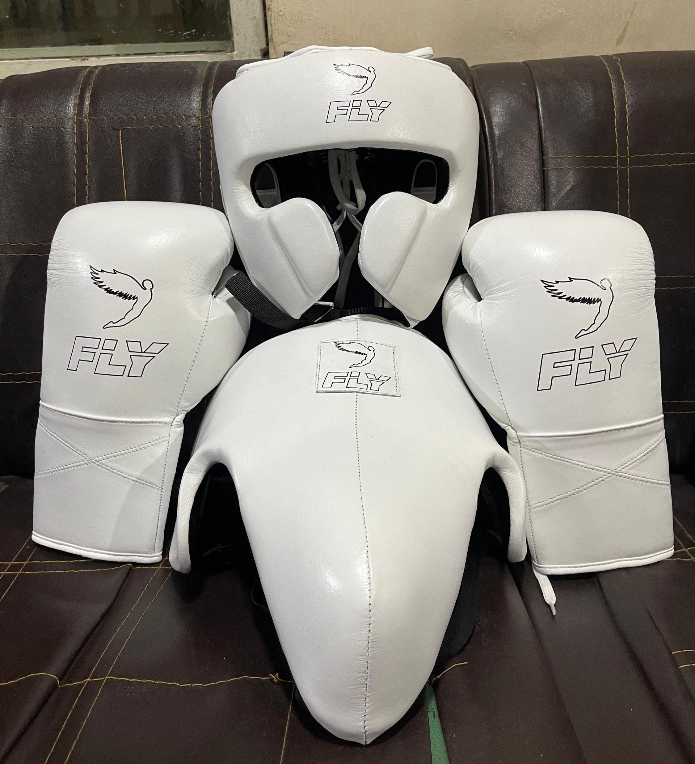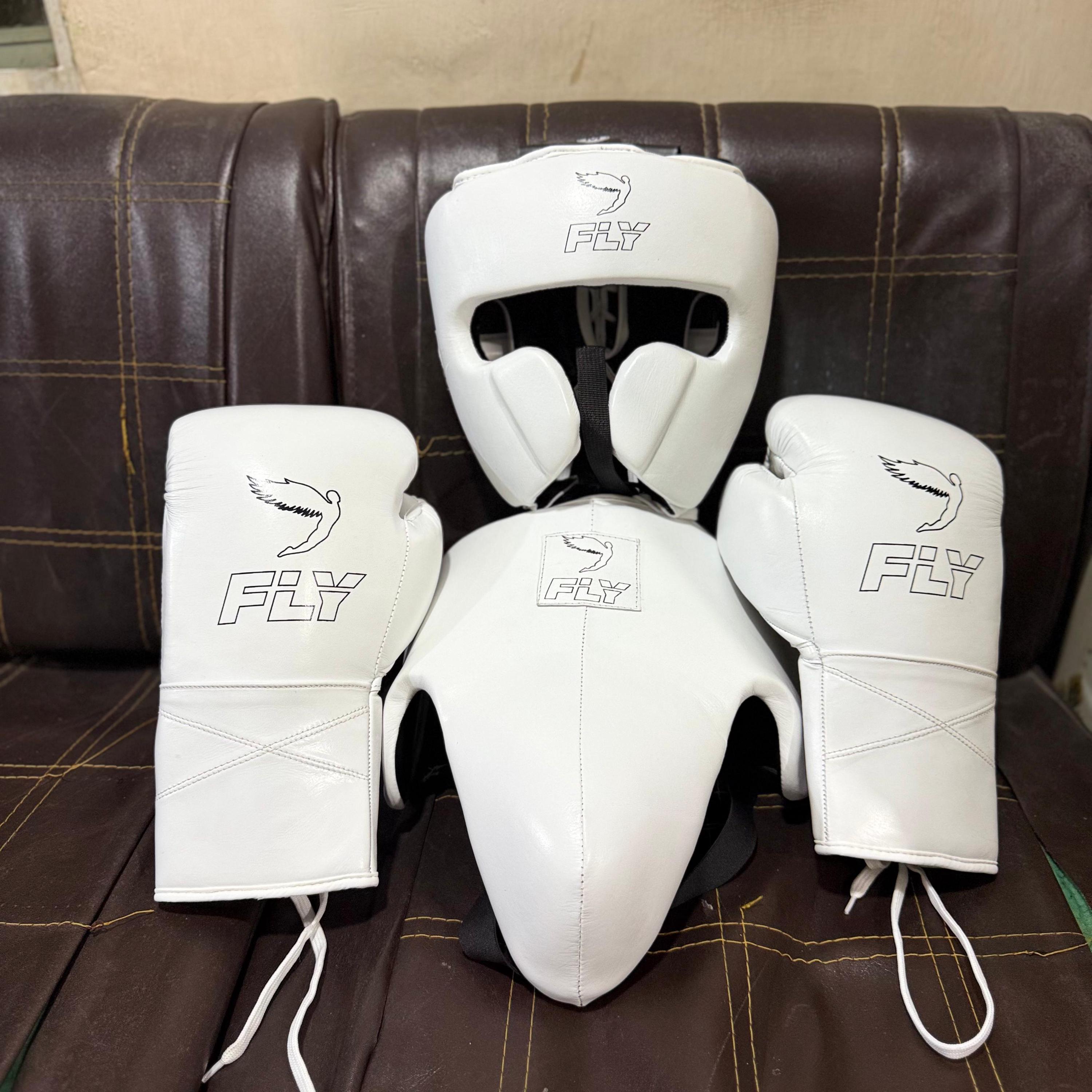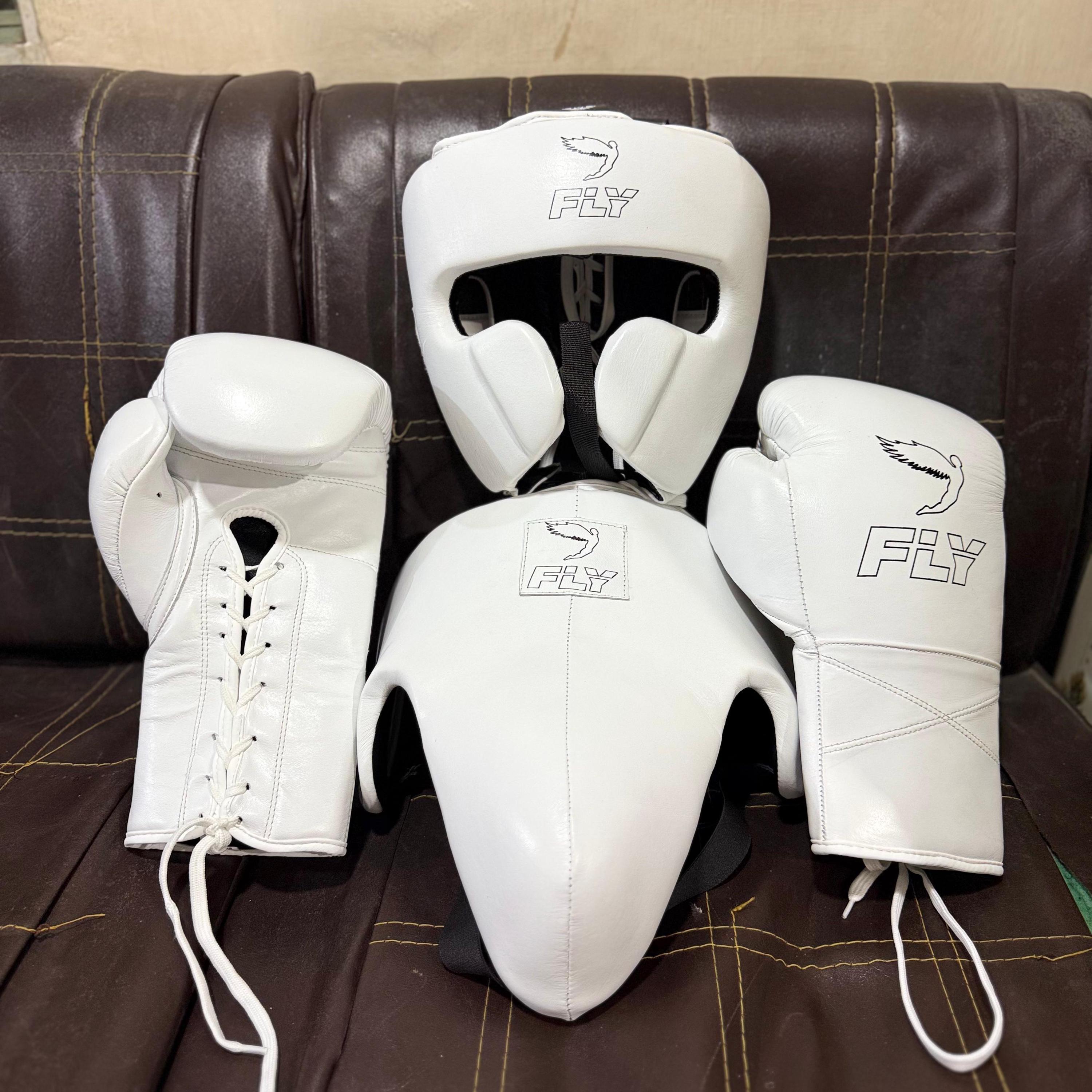 The White Leather Boxing Set – Fly Boxing Gear Style is a premium-quality fight equipment combo made for serious boxers and athletes. This professional set includes boxing gloves, protective headgear, and a groin guard, all crafted in a sleek white leather finish for a clean and elite look.